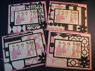 Well it must be the year of weddings, I'm in the process of getting all the supplies for the youngest ones invites, and she was here making bridal shower invites for a friend of hers that is getting married in June, so I thought I would share her creations. She has made 22 invites, same layout but with all different co-ordinating papers...very funky and very much her. She used a Bella stamp-"Bridalpartybellas" and did some paper piecing with the dresses and then we (yes I said we...I got coerced into helping) punched some little flowers from a fiskars edge punch and made them into the bouquets...lots of finicky work but they are one of a kind bridal shower invites.