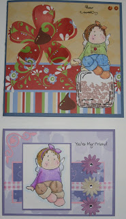 Okay I know I said in an earlier post that we were going to pick whatever stamp we wanted and have it a surprise.....well we decided on picking a Magnolia stamp but whatever one we wanted to use......well guess what?!!! Yeah - thats right we both picked the same one - go figure. For next week we are back to the original plan----whatever stamp we want, lets see how long that lasts! "Sitting Tilda with bow in hair" was the stamp of choice, we both had flower(s) added on to our cards - cardzgal's was a Quickutz 3D die, I used prima flowers; cardzgal cut out her Tilda and popped her on a stamped jar by Judith's stamps and added some baubles and quickutz chocolate drops, I added ribbon and some bling to the flowers also a diecut from the cuttlebug line. Can't wait to see what we do next week. Have a good one - enjoy March Break!