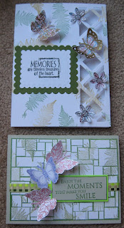We did our weekly exchange as well. Funny thing, on one of our days out we discussed some of our stamps that we should use or that we had.....and I guess the one stamp line stuck in our minds....cause....thats right.... we used the same stamps again this week.....I don't know, maybe we spend way too much time together....hahahahahaha! We purchased these stamps at a couple of stamp shows last year, Purple Daisy Designs (no web site). Some of the stamps they make fit some of the EK Success Paper Shaper punches - the butterflies we used. I also used a stamp from Starving Artistamps, a mosiac backgroundand a sentiment from Hero Arts. I wonder what I can plant in cardzgal mind to make for next week-insert evil laugh here!