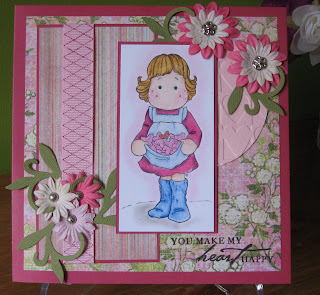 For my card I used Tilda with an apron full of hearts, coloured her in with prismacolor pencils,the hearts were coloured with Sakura pens, the dp is from a K & company stack,used a cuttlebug embossing folder on the pink paper, ribbon from my stash and flowers from my stash that were attached with nailheads from American Tag. I tucked in a Quickutz die around the flowers. I hope that my cards holds up to all the other great cards. Thanks for a great sketch.