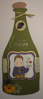 For this weeks challenge over at Just Magnolia is to make a shaped card...."its not for squares". So here is my card - I made a wine bottle shaped card and I used Bartender Edwin, coloured him in with prismacolor pencil and cut him out with my nesties, popped him on the bigger label(which is also popped) which is edge in gold krylon pen, the bottom layer is embossed with the script embossing cuttlebug folder and also edged with the gold Krylon pen, to give it that wine label look. I punched a circle again edged in krylon gold and added a grape button, added some flowers with Bella baubles and some spiralled wire, added ribbon and a sentiment; on the drinks added some glossy accents to make them look like glass. Cheers to all.