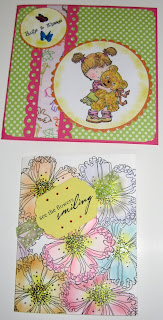 For our cards- Cardzgal used a Stampavie stamp, flowersoft, spellbinders and a Martha Stewart border punch; she coloured the image with Prismacolor pencil crayons. I used a Stampendous stamp, did lots of masking and chalked for the colour, the sentiment is from Hero Arts and added some stickles(may not see that in the picture).