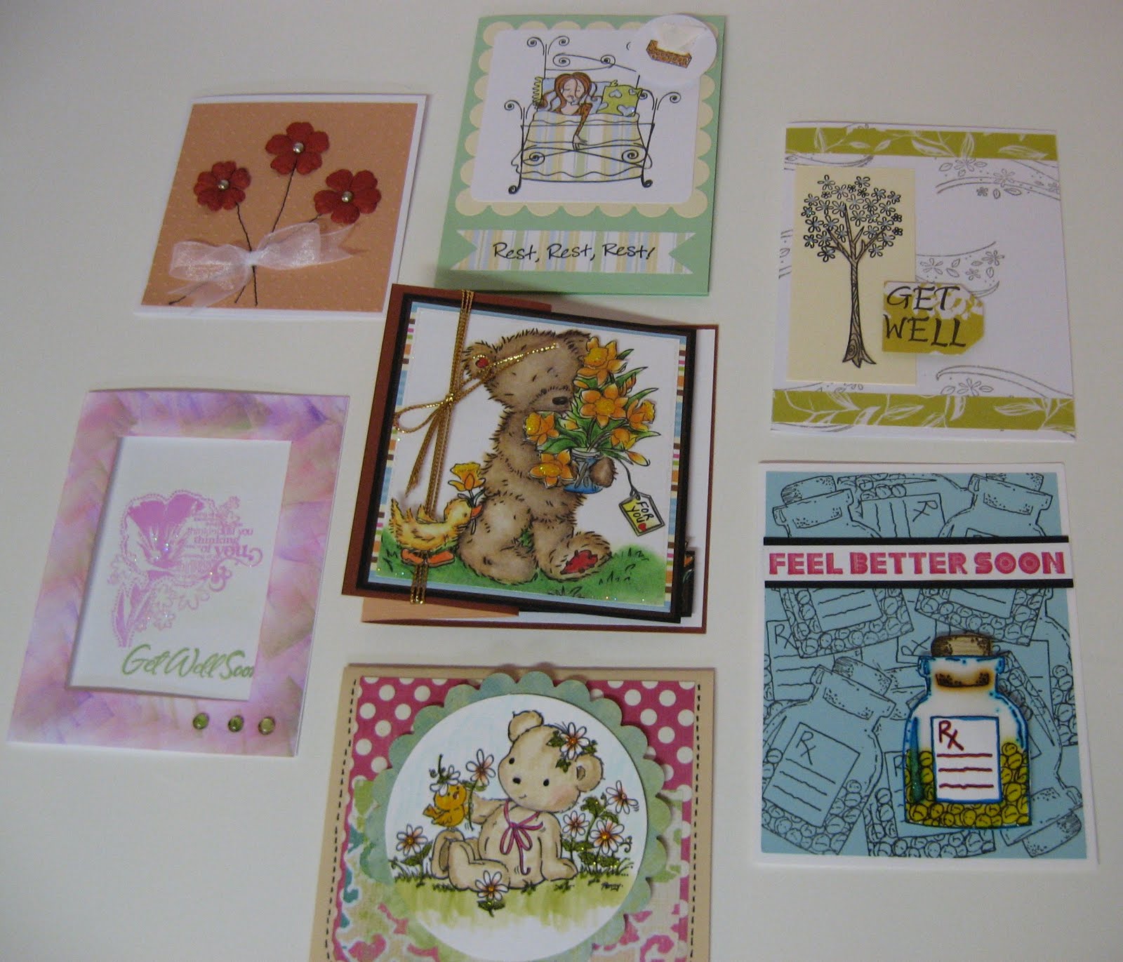 So onto the card-making part of this blog......the card exchange group met on Sunday May 2 and the theme for this month was GET WELL. I may say this everytime but I really mean it.....what a great set of cards we got this month. We had a new member join us which is really awesome, some fresh creativity and ideas for all of us to learn from. Welcome, Welcome!!!
